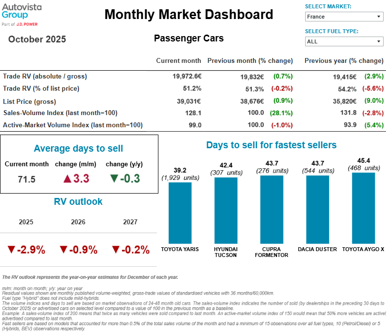 « Le délai moyen de vente d’un véhicule d’occasion est resté stable en octobre, à 64,9 jours. En glissement annuel, cet indicateur s’est amélioré de 2,1 jours, ce qui suggère une légère accélération de la rotation », explique Robert Madas, directeur régional des valorisations chez Autovista Group.